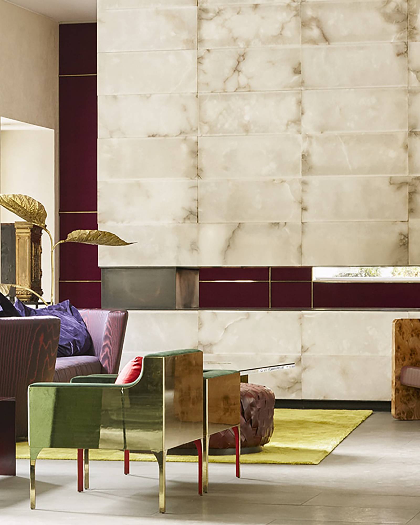 One of the most emblematic spaces in the hotel is the lobby, where our alabaster shines in a fireplace, creating a bold design reminiscent of classic European opulence and glamour.